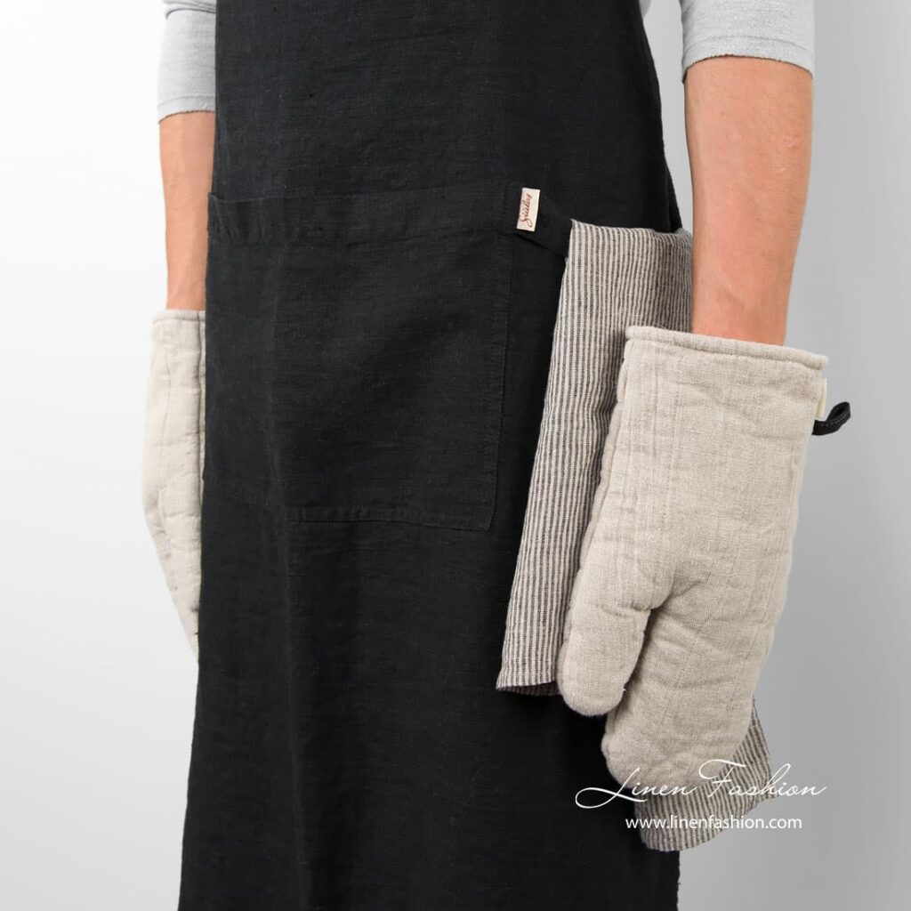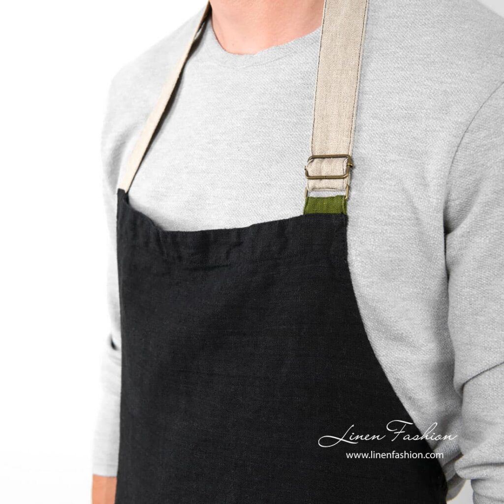 - Detaily: jedno veľké predné vrecko, nastaviteľný remienok okolo krku z prírodného ľanu, pútko na zavesenie utierok na boku