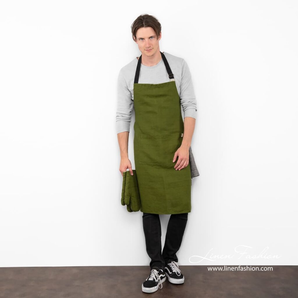 - Detaily: jedno veľké predné vrecko, nastaviteľný čierny popruh okolo krku, pútko na zavesenie utierok na boku