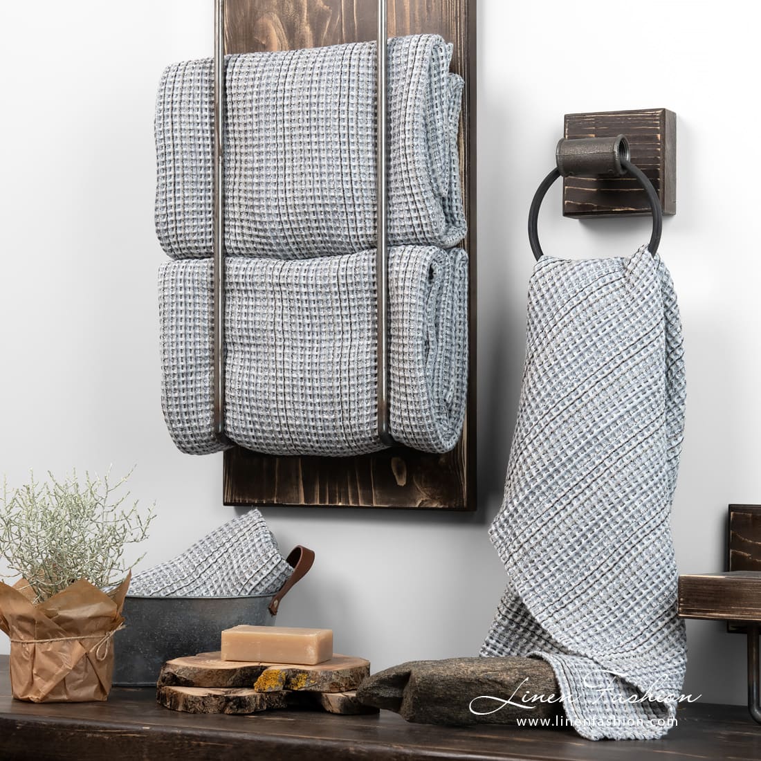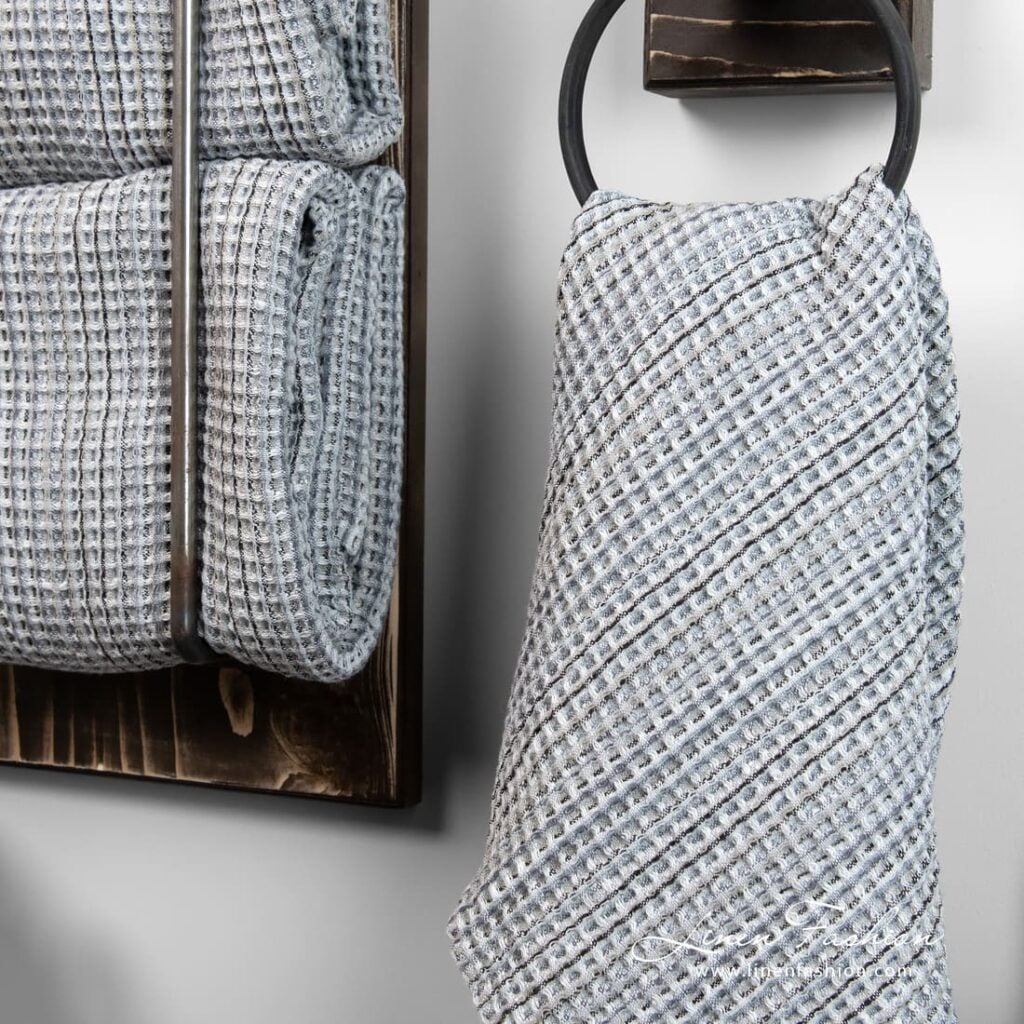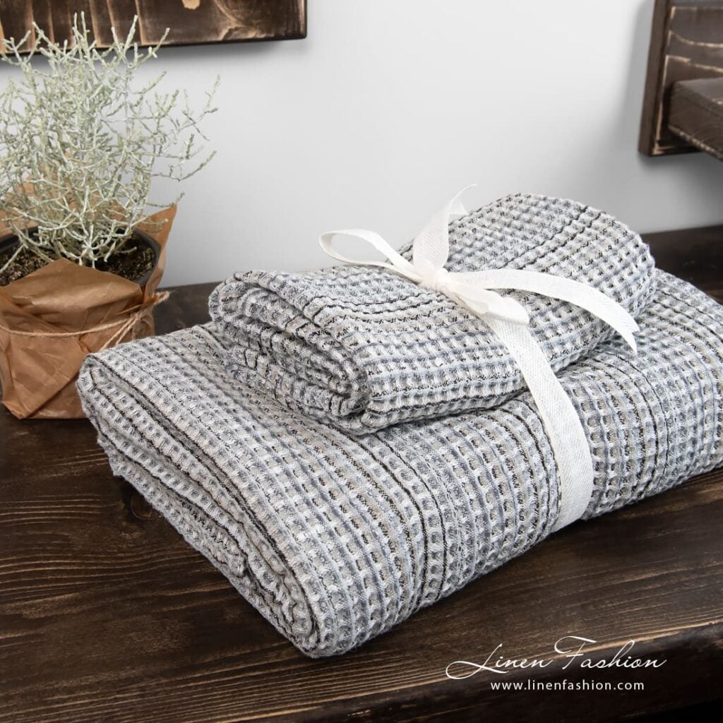 - Detaily: s pútkom na zavesenie, sada dvoch uterákov je previazaná širokou stuhou