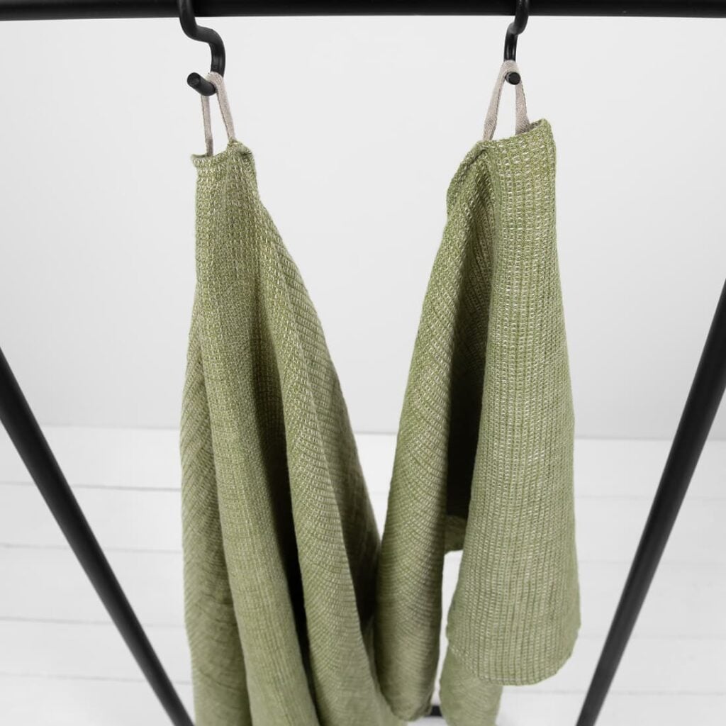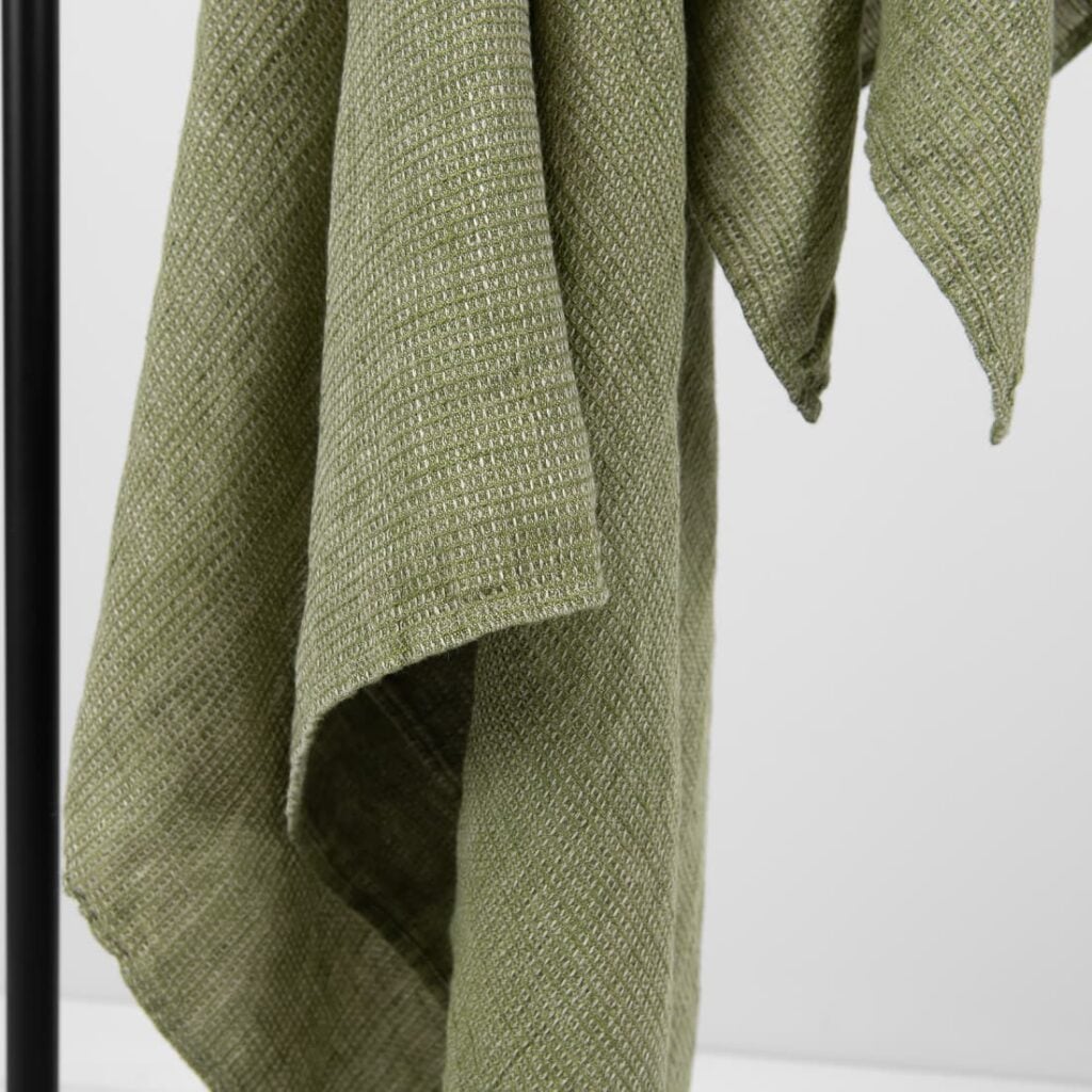 - Farba: zmes prírodného ľanu (nefarbený, hnedosivý) a priadzí vo farbe papraďová zelená