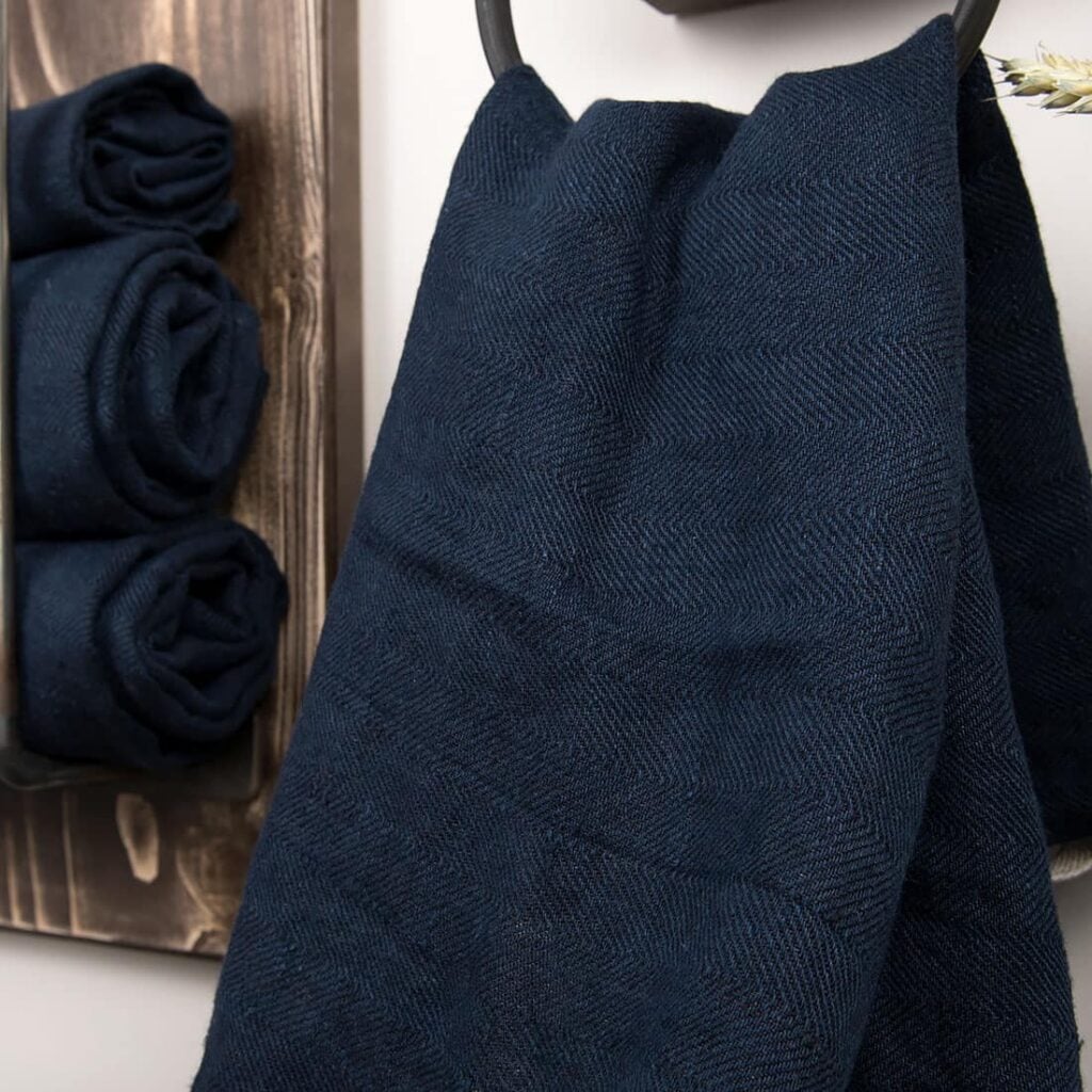 Ľanová osuška tmavomodrej farby. Je vyrobená zo 100% pranej ľanovej tkaniny, ktorá je tkaná vzorom rybej kosti z tmavomodrých a čiernych priadzí. Osuška je mäkká a dokonale absorbuje vlhkosť, vhodná na každodenné použitie.