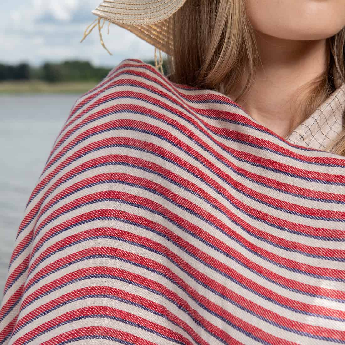 - Farba: zmes priadzí bieleho piesku, tmavej kobaltovej modrej, šarlátovej červenej a svetlej kakaovej