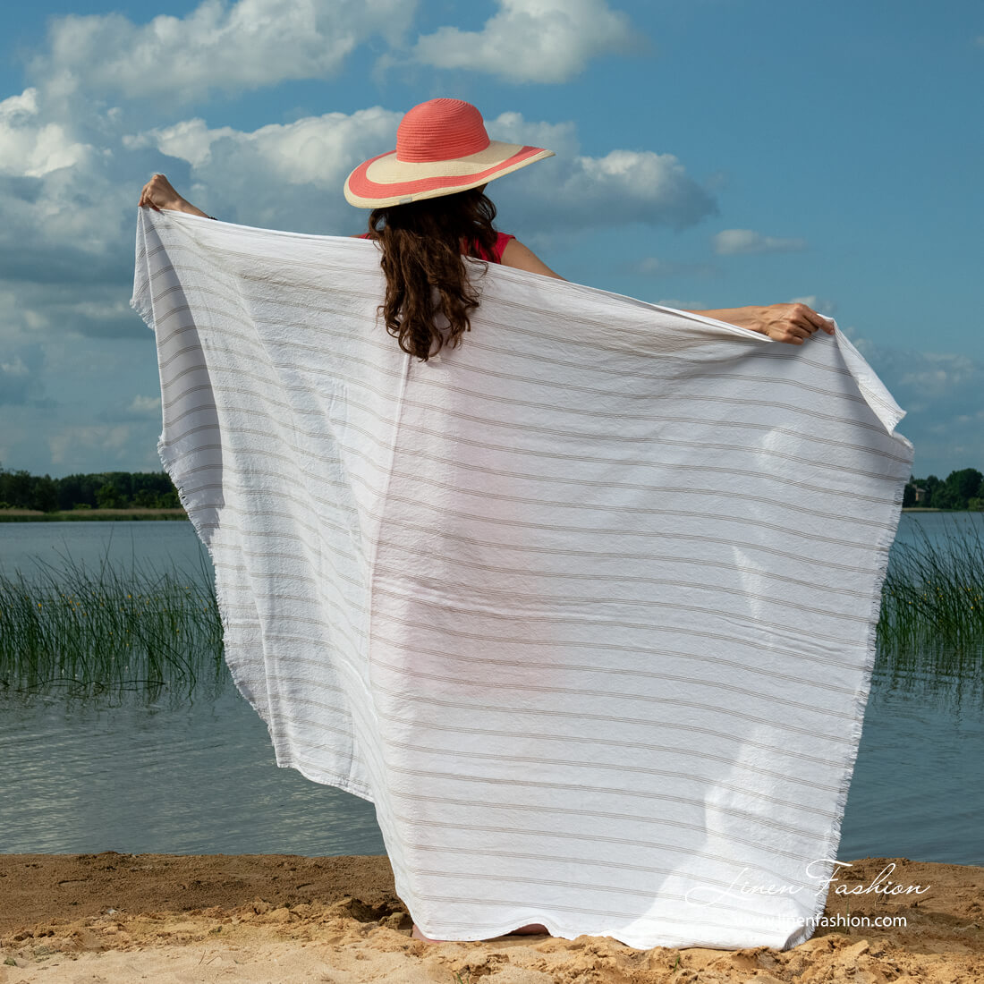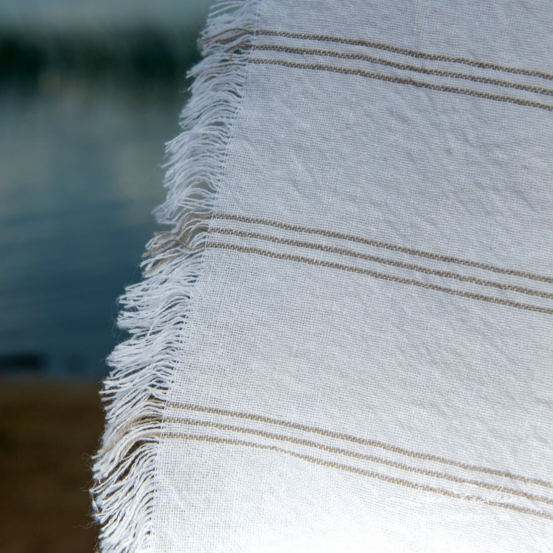 Biela pruhovaná plážová osuška so strapcami (2cm (0.7) na kratších stranách). Kvalitná osuška je ušitá z ľahkej špeciálne pranej bielej ľanovo-bavlnenej tkaniny s hnedosivými pruhmi. Je veľmi mäkká, vysoko absorpčná a rýchloschnúca.