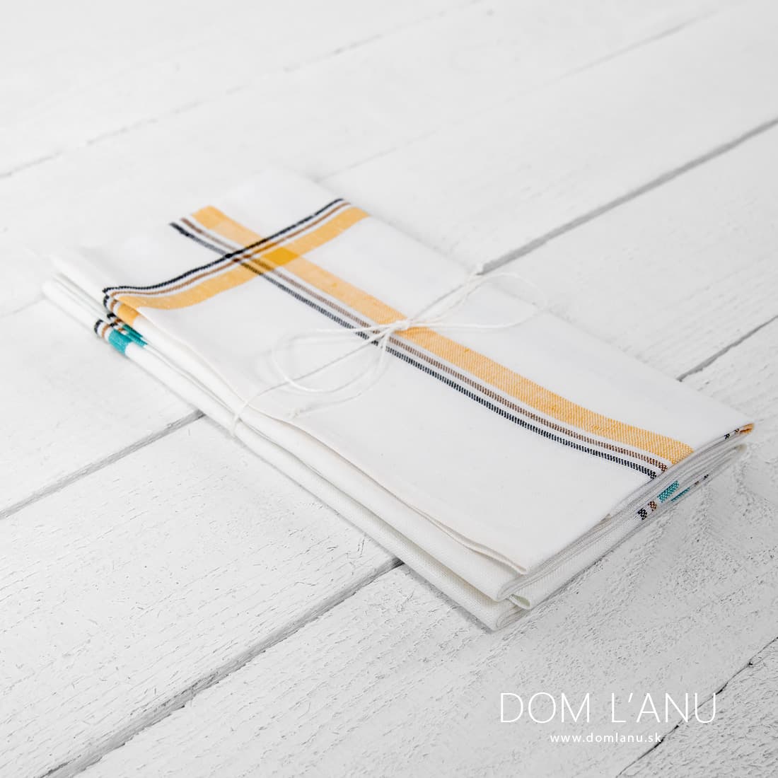 • Farba: mliečne biele (žltkasté biele) uteráky so žltými, zelenými, čiernymi a hnedými pruhmi