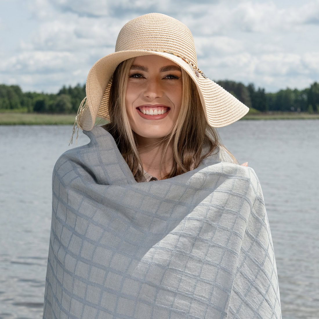 - Farba: tkaná modrošedá a svetlosivá priadza
