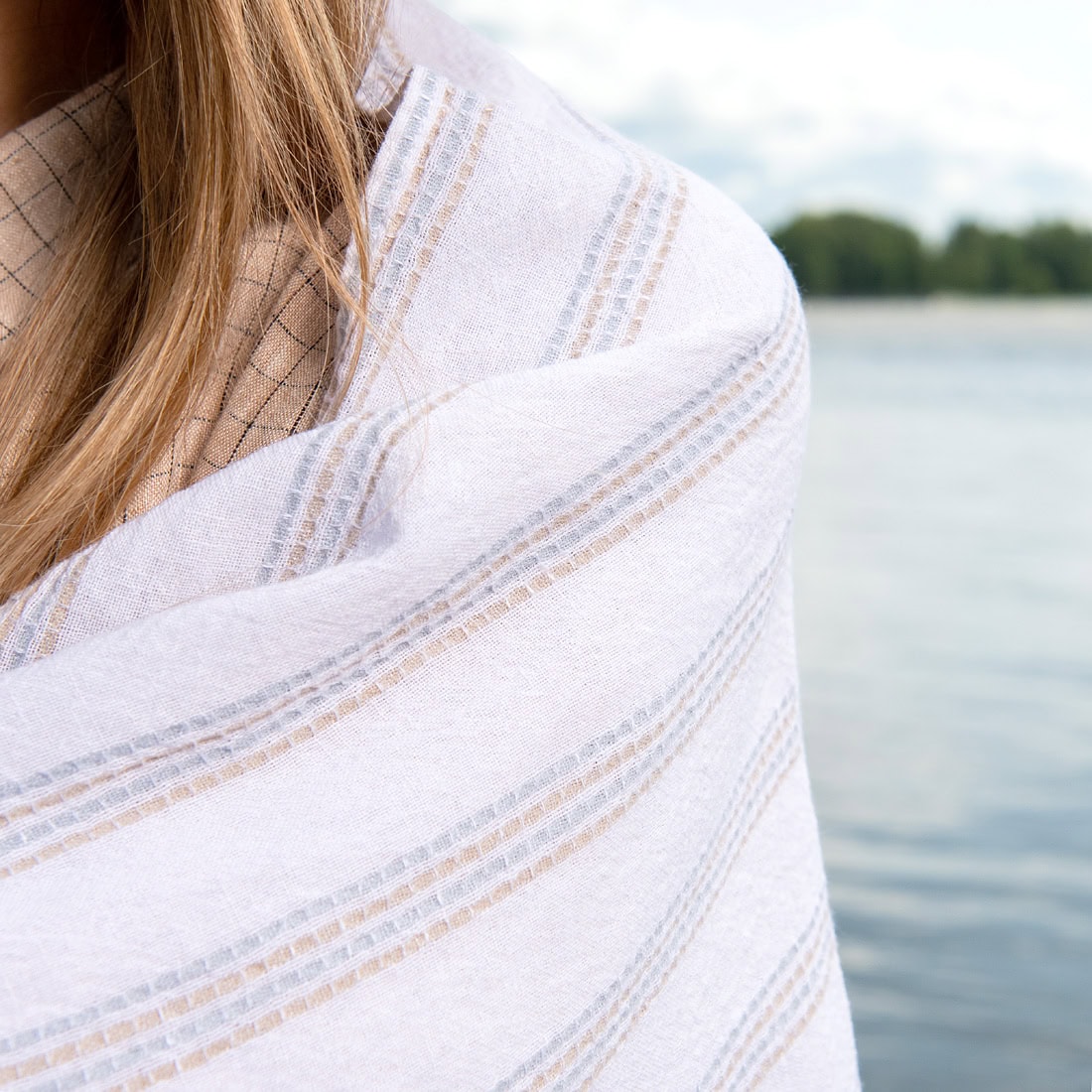- Farba: tkaná žiarivo biela, piesková (sivohnedá) a modrozelená priadza