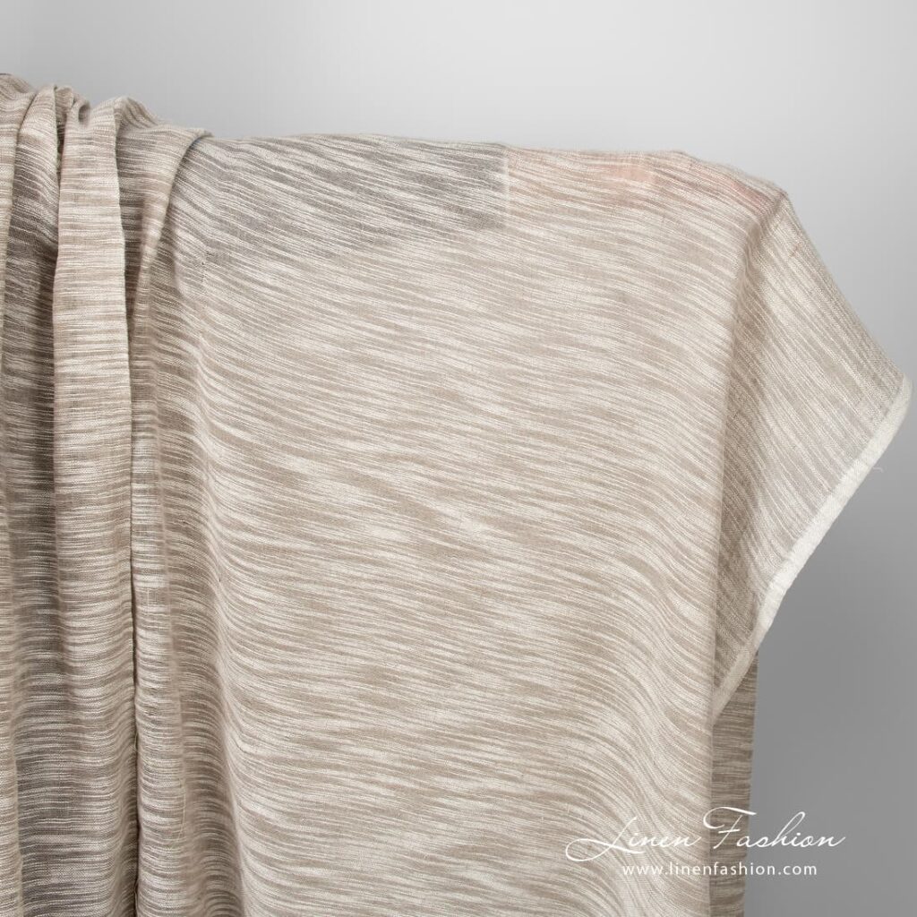 Ľanovo-bavlnená tkanina pieskovej farby s bielymi pruhmi
