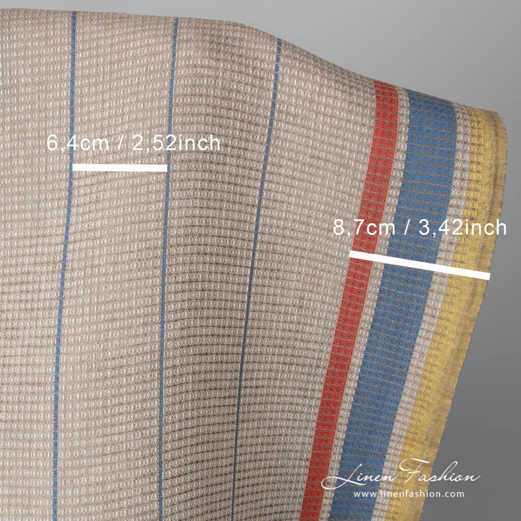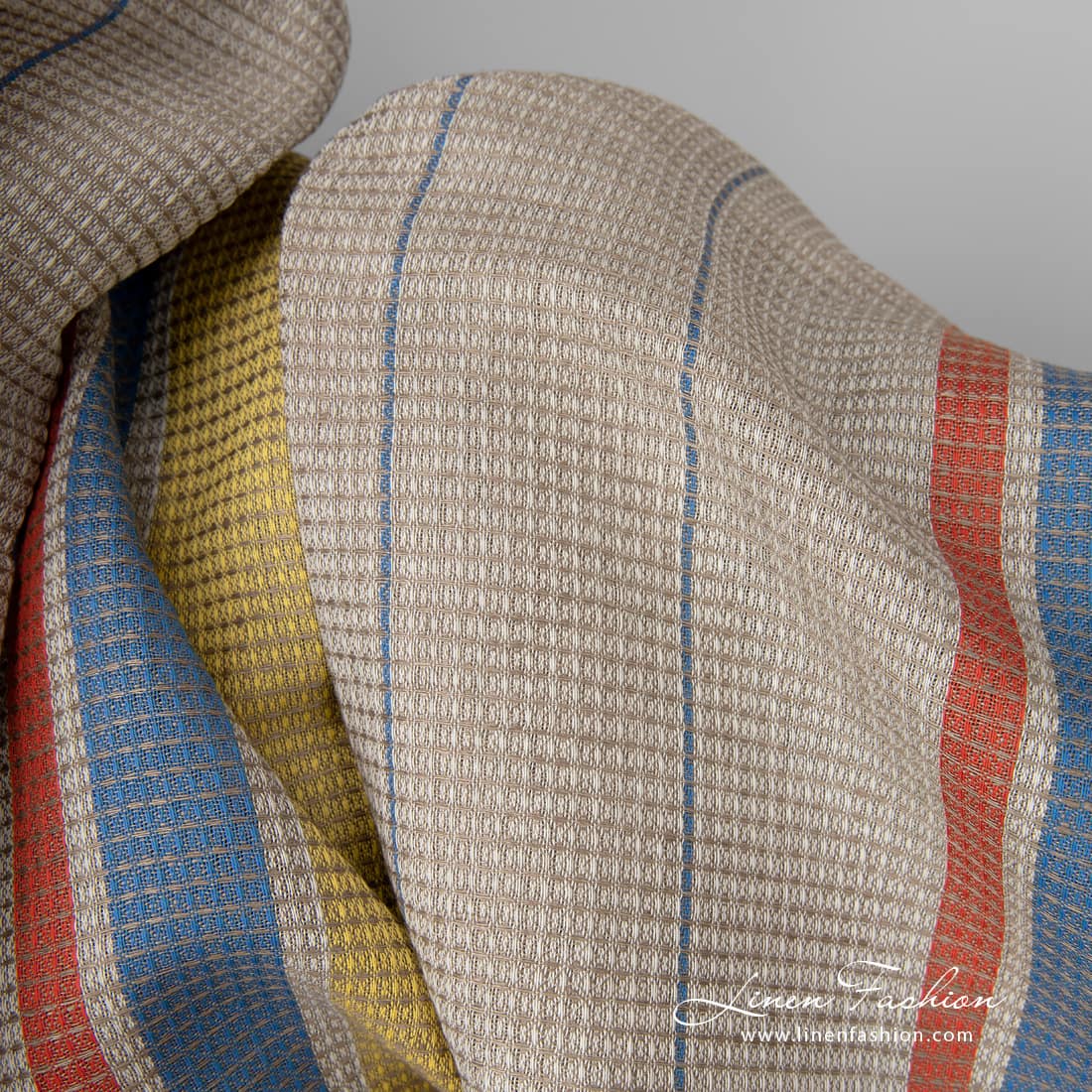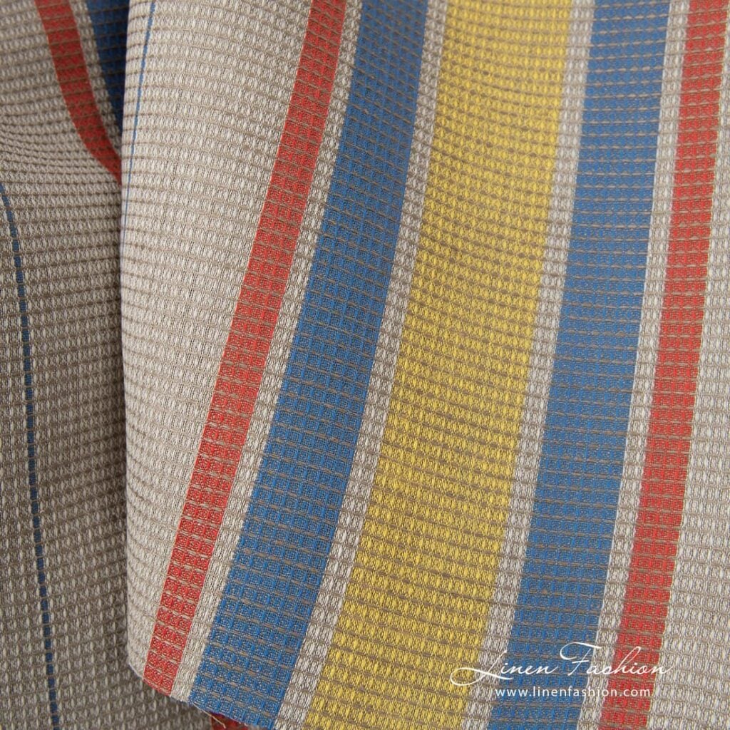 Ľanovo-bavlnená tkanina piesková vafľová so žlto-červenými pruhmi