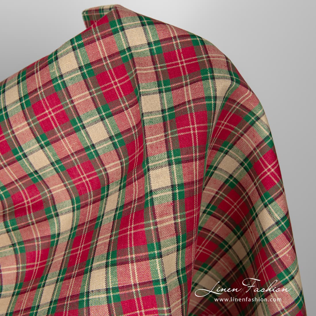 Ľanovo-bavlnená tkanina s béžovými a červenými kockami