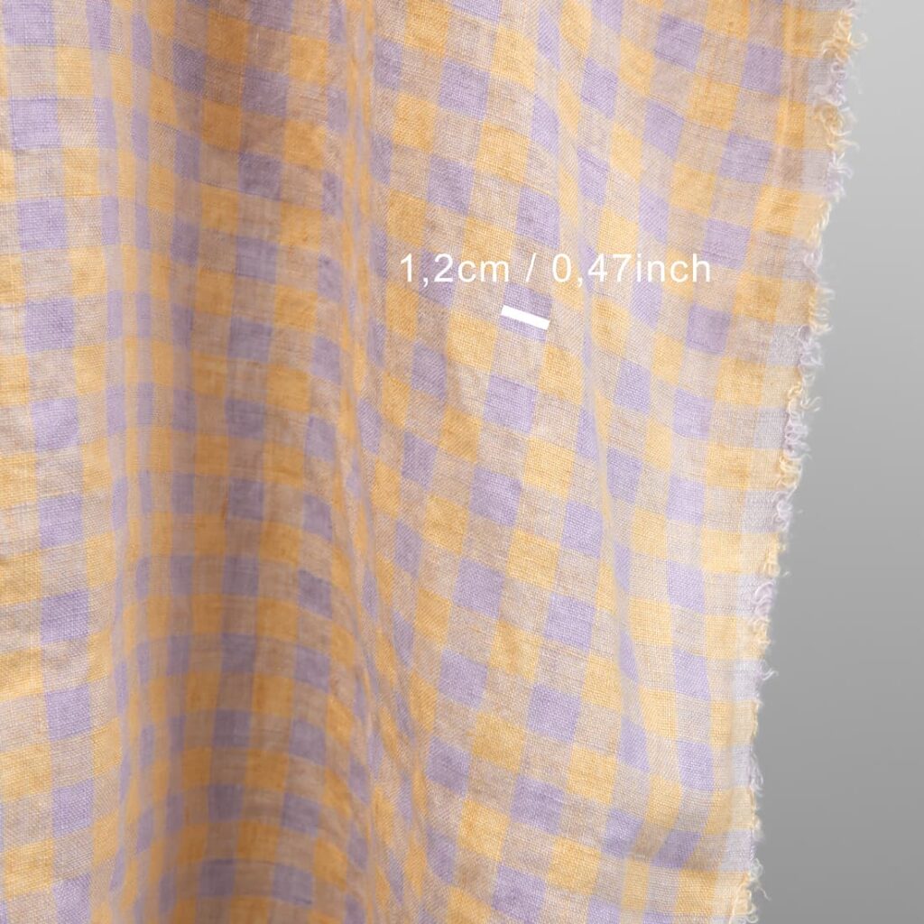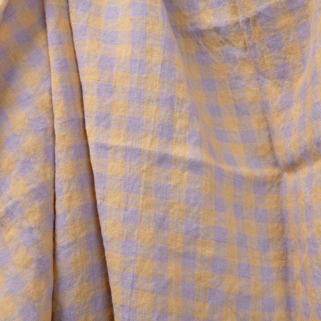 Ľanová praná látka v lila žltých kockách