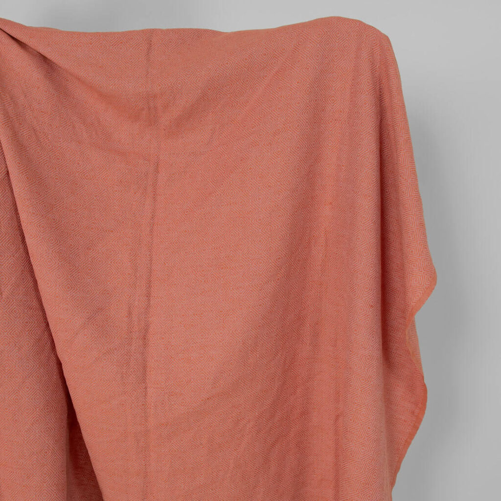 Praná ľanovo-bavlnená látka v oranžovo-orgovánovom kosoštvorcovom vzore