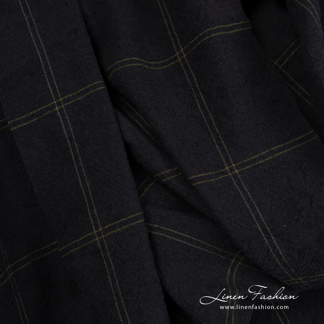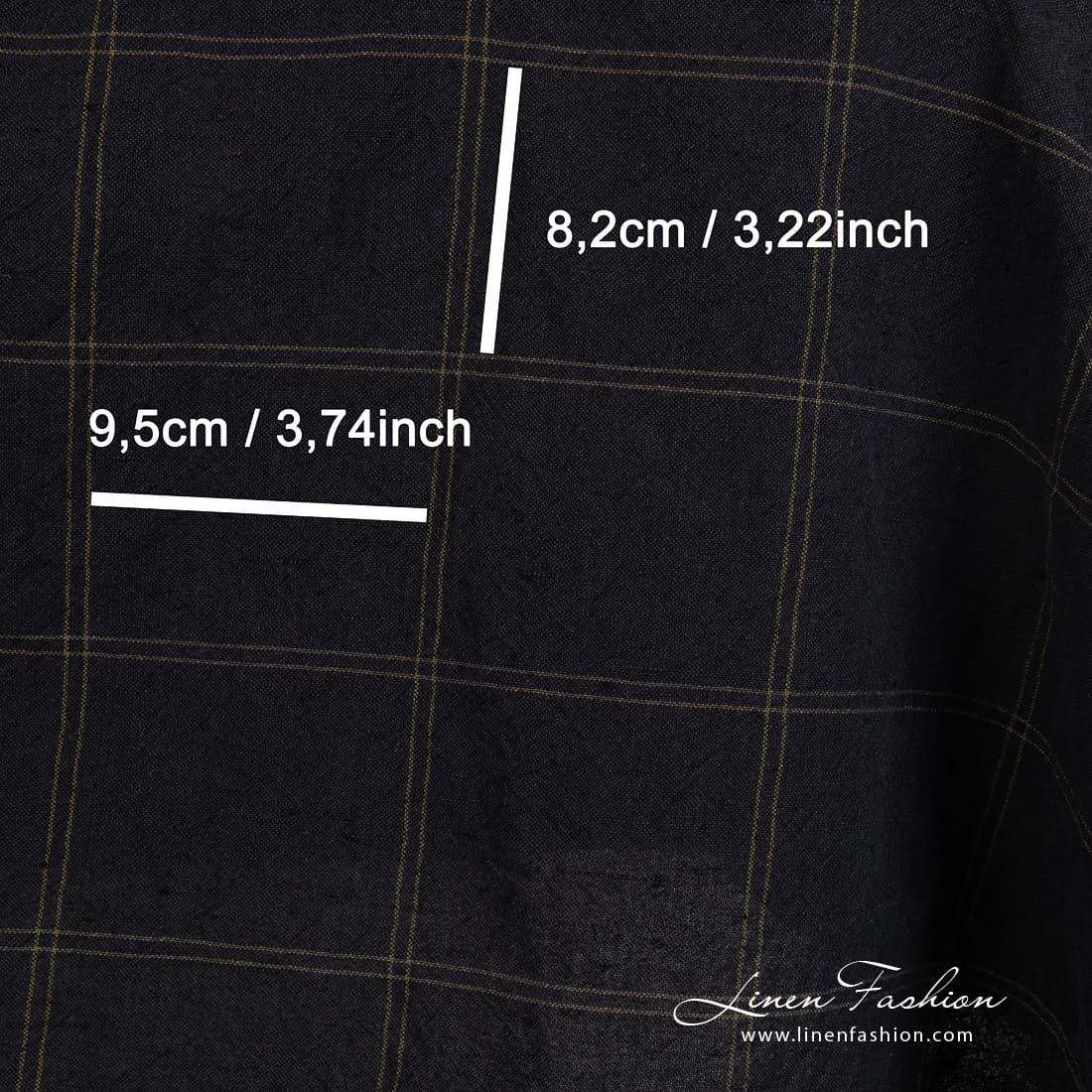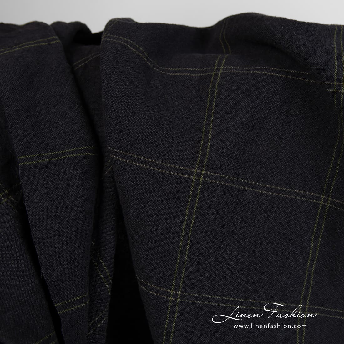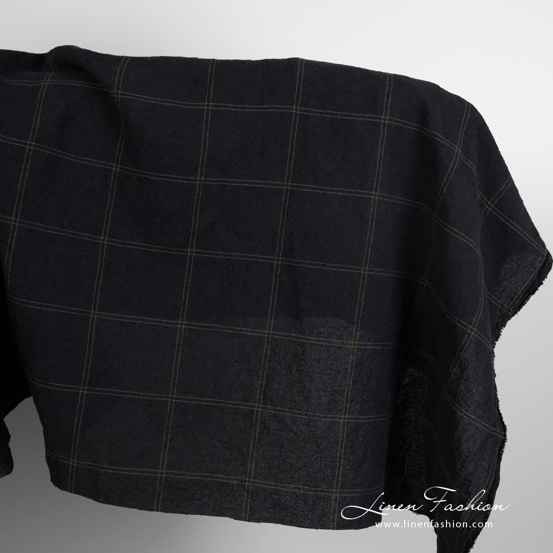 Široká čierna ľanovo-bavlnená tkanina v zelených kockách praná