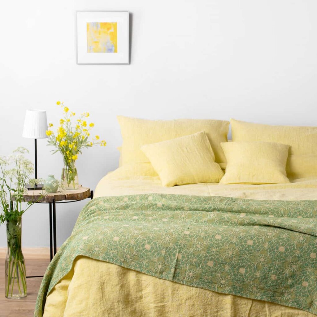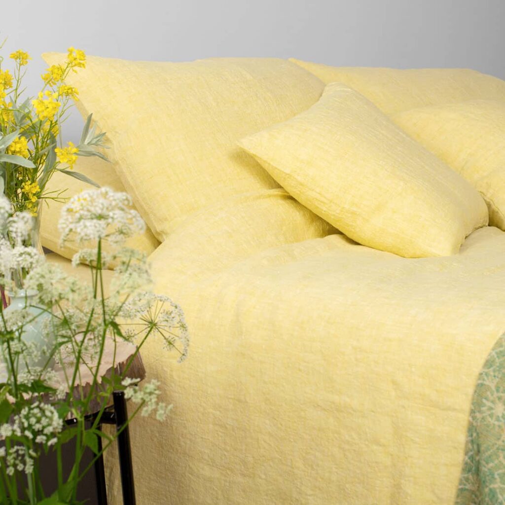 Žltá napínacia plachta z praného ľanu s gumičkou v rohoch.