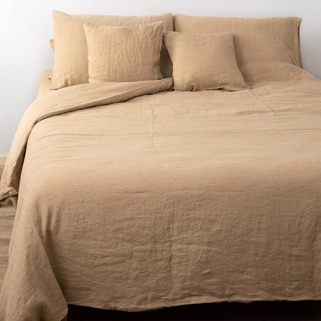 Svetlohnedá jednoducho oblemovaná ľanová plachta. Možno kombinovať s ľanovou obliečkou na paplón a obliečkou na vankúš z rovnakej kolekcie.
